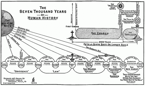 The idea of 7000 years of human history is based on the book Dispensational Truth or God's Plan and Purpose in the Ages by Clarence Larkin in1918. Larkin sketched his timelime as printed below. This is in line with the calculations of the highly respected Irish Archbishop James Usscher (1581 – 1656), who based his numbers on Genesis 5 & 7.